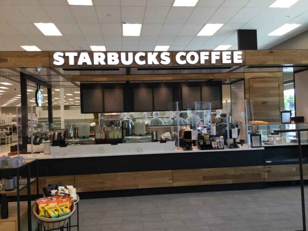 Already sporting a Starbucks bar near the entrance, the shelves were in and mostly stocked Wednesday — although the mannequins still needed clothes.